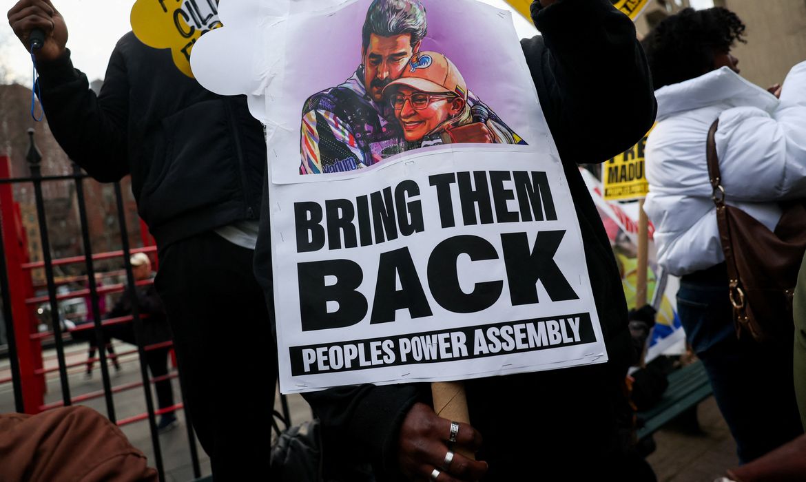 Ele e a esposa seguem presos em Nova York, quando foram presos durante uma operação das forças militares dos EUA na Venezuela em janeiro. Do lado de fora, manifestantes pediam a libertação de Maduro.